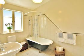 •Large kitchen and modern bathroom with claw foot bath