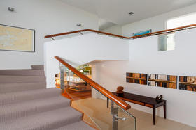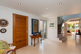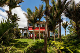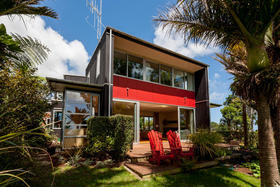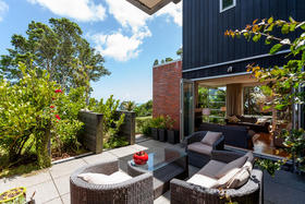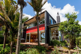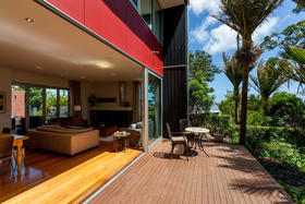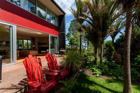 Just off the centre of Oakura Beach, this stylish contemporary home is nestled amid an ancient grove of Nikau Pohutukawa and Rimu trees giving shelter, privacy and a wonderful woodland ambience.