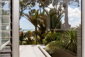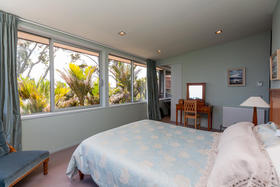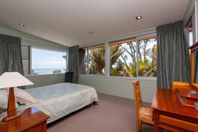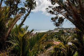 There are stunning views of the beach below and eastwards to the Sugar Loaf Islands, framed through towering trees and Nikau palms.