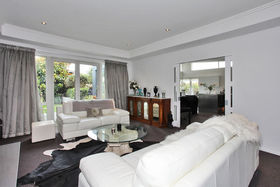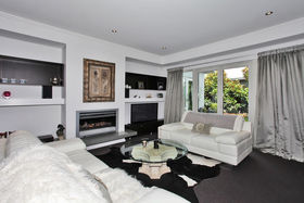 A separate formal lounge with gas fire has cabinetry and fitted shelving including a sound system that pipes music throughout other rooms of the house.