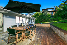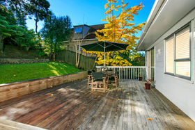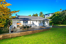 Offering three double bedrooms, one bathroom, open plan living/dining with great flow to a large deck, perfect for BBQs with friends. This grassy section in a quiet cul de sac, makes a great retreat for both adults and children. Below the house there is a large double garage, plus lots of parking space in front.